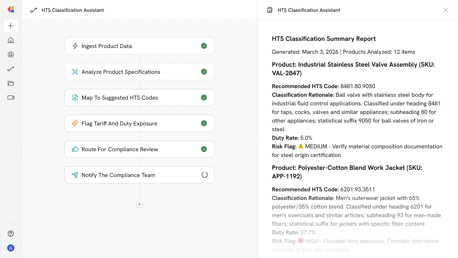 The Workflow matches each product to the most appropriate HTS classification, generating a rationale and source references for each recommendation so compliance teams can see exactly why a code was suggested.