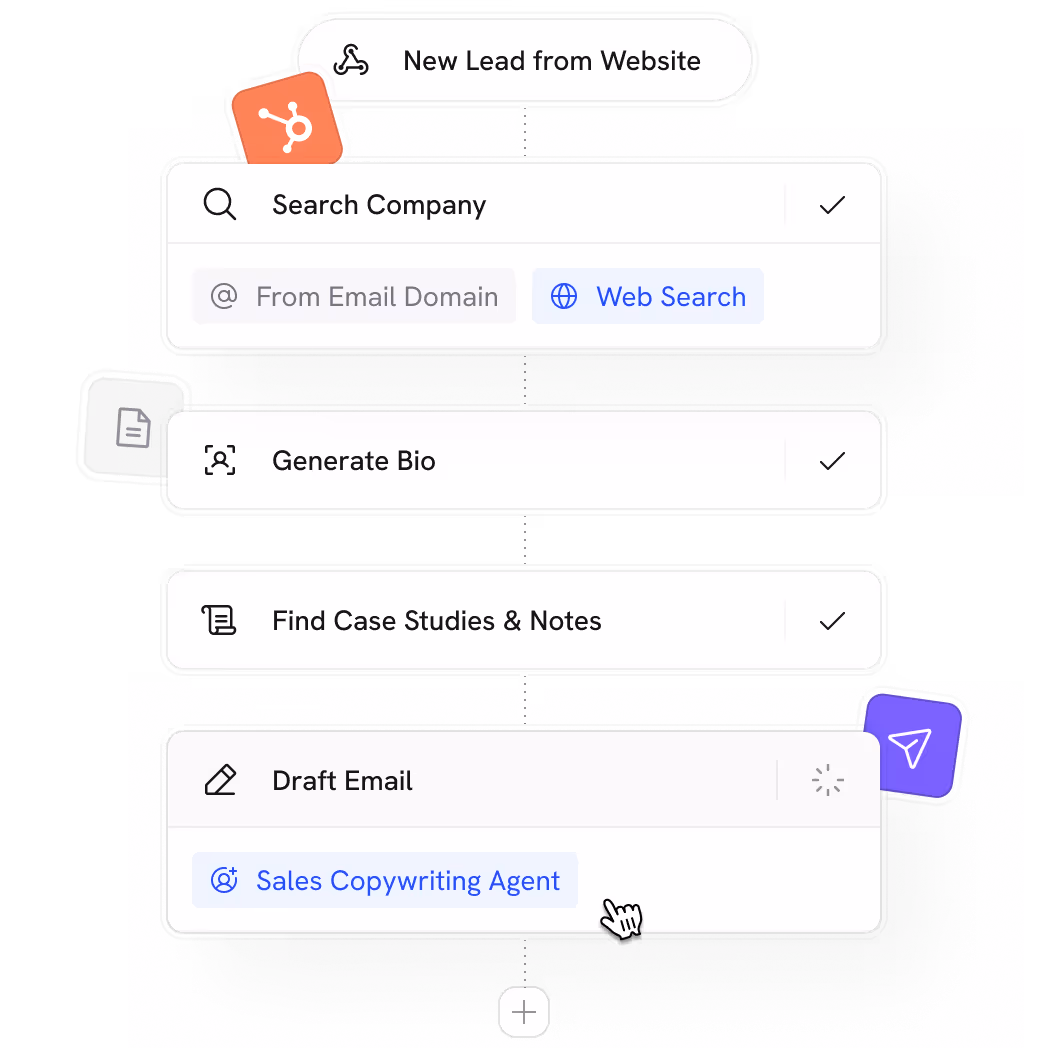 Workflows support 100+ pre-built actions: generate content, search your Knowledge Base, send emails, update Salesforce or HubSpot records, create documents, post Slack messages, route data based on conditions, loop through lists, and more. You can also connect to any service via webhooks and API.
